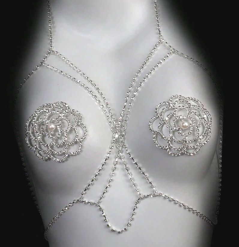 Nalepke za bradavičke iz kovinskih verižič. posutih s kristalčki (cirkonij). na sredini katerih je biser. Nalepke so samolepilne. V kompletu sta 2 kosa nalepk in verižica za telo. Sestav: kovina. steklo