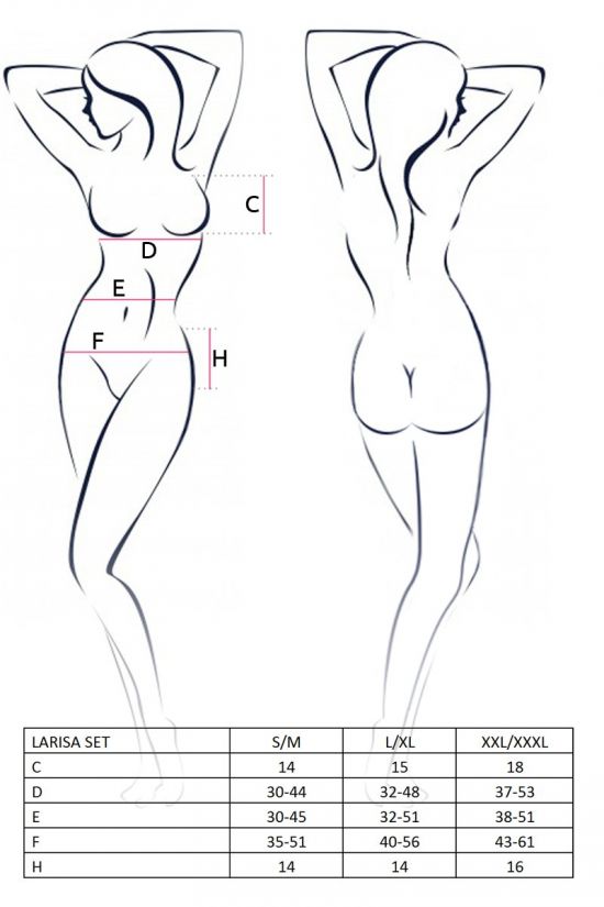 Komplet Larisa združuje eleganco črnih črtastih mikrovlaken, ter žgečkljivost z belim rahlo prosojnim plenom. Komplet sestavlja nederček s poudarjenimi košaricami za dodaten volumen oprsja, široki pas za nogavice s trakovi, ter minimalistične tanga hlačke. Komplet je na voljo v vseh konfekcijskih številkah in je izdelan iz udobnega materiala.