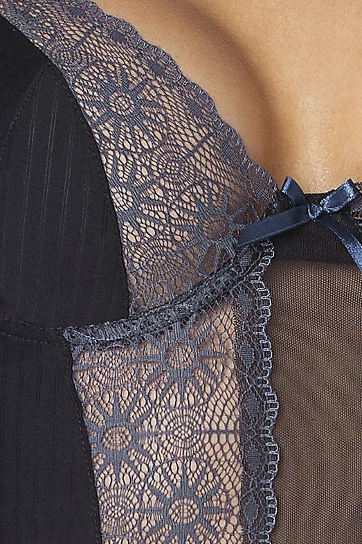 • Pokažite mu zapeljivo podobo v vrhunskem negližeju Madlen.   Negliže Madlen ima eleganten dizajn s črtasto teksturo, ki jo dopolnjujejo nežni detajli prosojnega tila ter fine italijanske čipke v grafitnem odtenku. Njegov dizajn je oprijet, sprednji