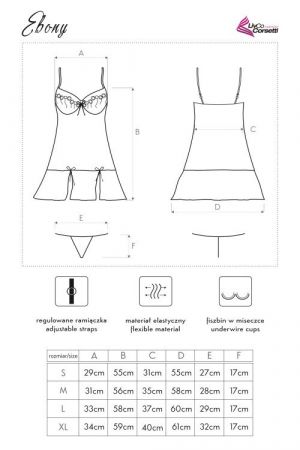 Negliže Ebony ima nagajiv dizajn, ki ga sestavljajo utrjene košarice ter prosojni material na spodnjem delu. Dva nagajiva razporka na zaključku negližeja poskrbita za dodatno žgečkljivo draženje, medtem, ko izvezeni vijolični detajli popestrijo celoten izgled oprave. Negliže Ebony je na voljo v vseh konfekcijskih številkah, in je sestavljen iz mehkega ter elastičnega materiala. Popolno prileganje in udobje v kombinaciji s seksi izgledom - Le en in edini negliže Ebony!