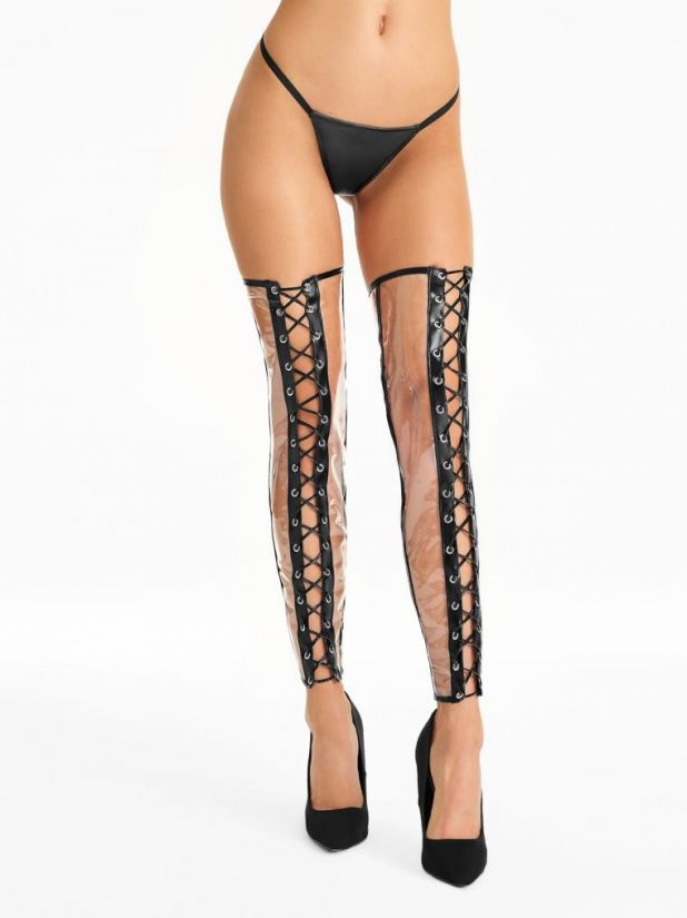 Nogavice S552 imajo atraktiven dizajn iz prozorne folije s črnimi navpičnimi trakovi v mokrem videzu, ki optično podaljšajo noge in korzetnim zavezovanjem za popolno prileganje. Te neverjetne in obenem nekonvencionalne nogavice, bodo poskrbele, da se vas bo za vedno spominjal. Idealen kos tudi za ljubitelje fetiš oblačil!