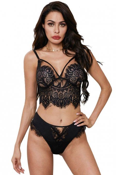 Komplet Anna ima na zgornjem delu kratek top, ki je okrašen s čudovito vzorčasto čipko in trakovi s katerimi boste poudarile polnost oprsja. Na spodnjem delu pa so priložene še ujemajoče se tanga hlačke z rahlo povišanim pasom, ki ustvarja peščeno obliko.