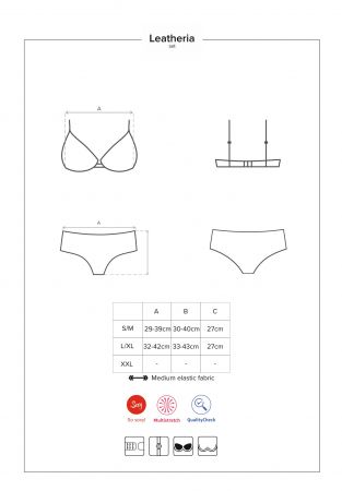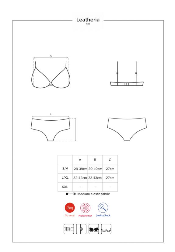 Komplet Latheria ima seksi mokri videz in združuje dva zelo lepa erotična kosa. Komplet vključuje posebno oblikovan nedrček z okrasnimi trakovi in kovinskimi detajli ter boksarice s prosojnimi vstavki za dodaten seksapil. Komplet bo poudaril vaše ženstvene čare in poskrbel, da bo vzdušje v spalnici še bolj vroče. Presenetite ga v bolj dominantni podobi!