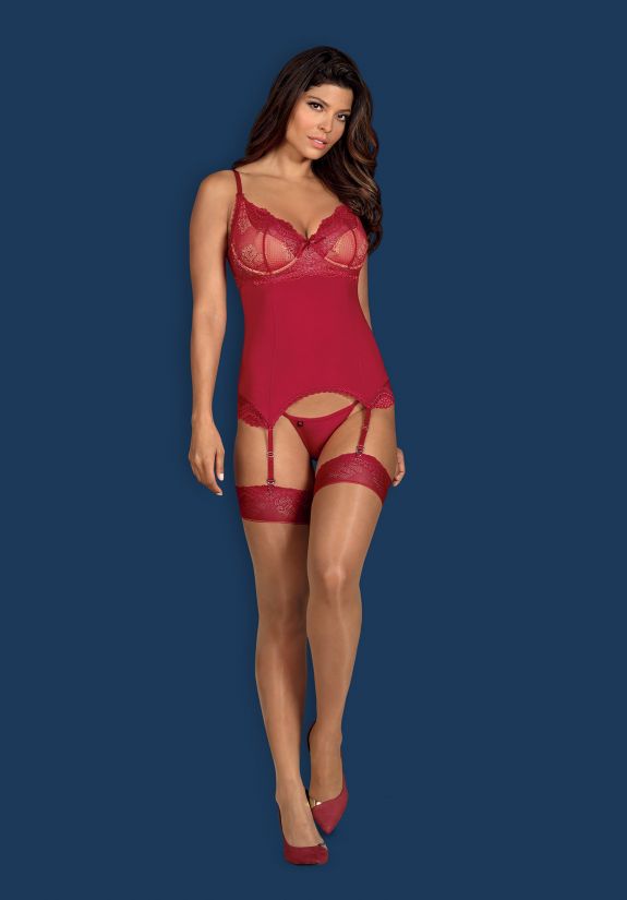 Korzet Rosalyne prinaša razkošen videz v vinsko rdečem odtenku. Ima posebno oblikovan kroj, ki zelo lepo poudari ženske obline in ustvarja mamljivo podobo ob kateri ne bo ostal ravnodušen. Korzet ima poudarjene skodelice, ki so primerne tudi za večje oprsje ter nastavljive trakove na hrbtni strani. V kompletu so priložene tudi tanga hlačke in jermeni za pripenjanje nogavic.