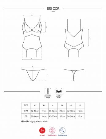 Korzet 810 je na voljo v nežnem belem odtenku in ima zapeljive detajle, ki poudarjajo žensko figuro. Okrašen z dodatki prosojne čipke na sprednjem delu in hrbtu, bo nudil seksi oblike, ki bodo navdušile tudi vašega ljubimca. Korzet ima mehke oblazinjene košarice zaradi katerih bo izstopalo tudi vaše oprsje. V kompletu so priložene hlačke in trakovi za pripenjanje nogavic.